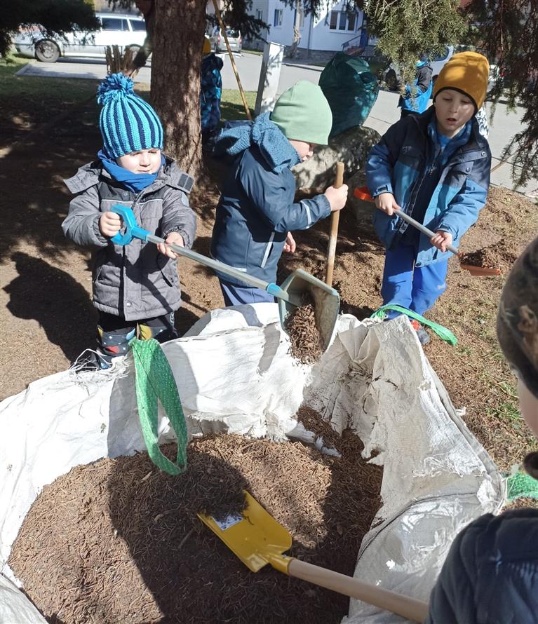 Uklízíme jehličí před školkou